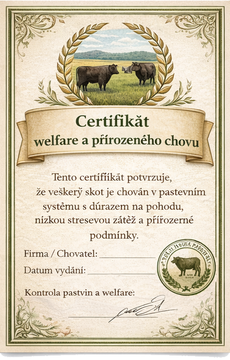 Potvrzení, že zvířata jsou chována v pastevním systému s důrazem na pohodu, nízkou stresovou zátěž a přirozené podmínky.