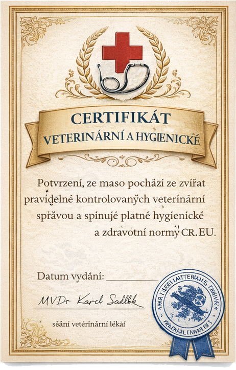Veškeré maso pochází ze zvířat pravidelně kontrolovaných veterinární správou a splňuje platné hygienické a zdravotní normy ČR a EU.